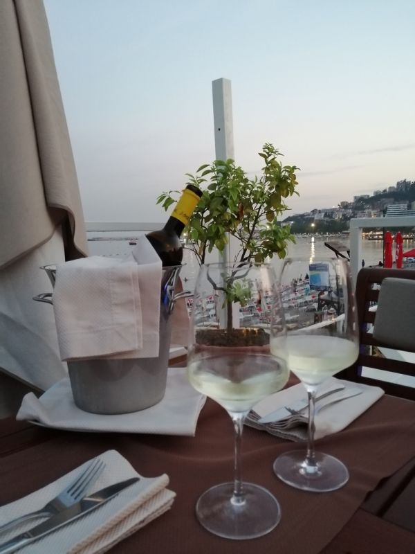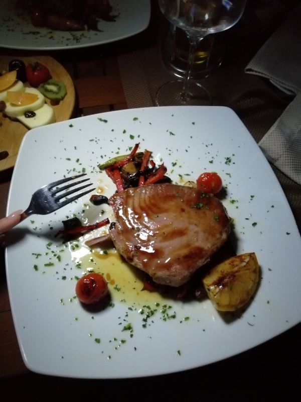 Оказалось, что с этим в Черногории беда. Да, это чисто мясная страна, как нам говорили. Море-продукты есть, но их мало. И стоят они дорого. Выбор наш пал на уютное кафе "Факел", потому, что там было весело и играла музыка. Проходил какой-то конкурс. Народа было много. Милый молодой официант предложил нам вип место на 2 этаже веранды, где открывался шикарный вид на море. Уговаривать нас не пришлось, тем более это было бесплатно. Я заказала тунца в соусе, Яна - кальмары. К блюдам нам белое вино за 24 евро, которое нам подали по всем правилам этикета, в охлажденных бокалах и с сырной нарезкой.
