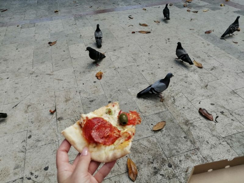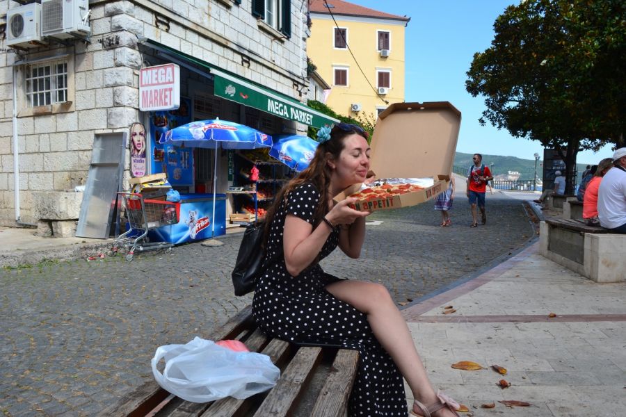 Ведь окончанием нашей поездки был венценостный Герцег- Нови, прекрасный город на горе. Его еще называют городом лестниц, так как дома располодены вверх по горе, а не совсем по побережью. Нужно было подниматься наверх, на смотровую крепость, но мы с Яной так выдохлись, что решили перекусить пиццей. Прямо на главное площади города под белоснежными магнолиями и в окружении стайки голубей, которые не брезговали нашей пиццей прямо из наших рук.