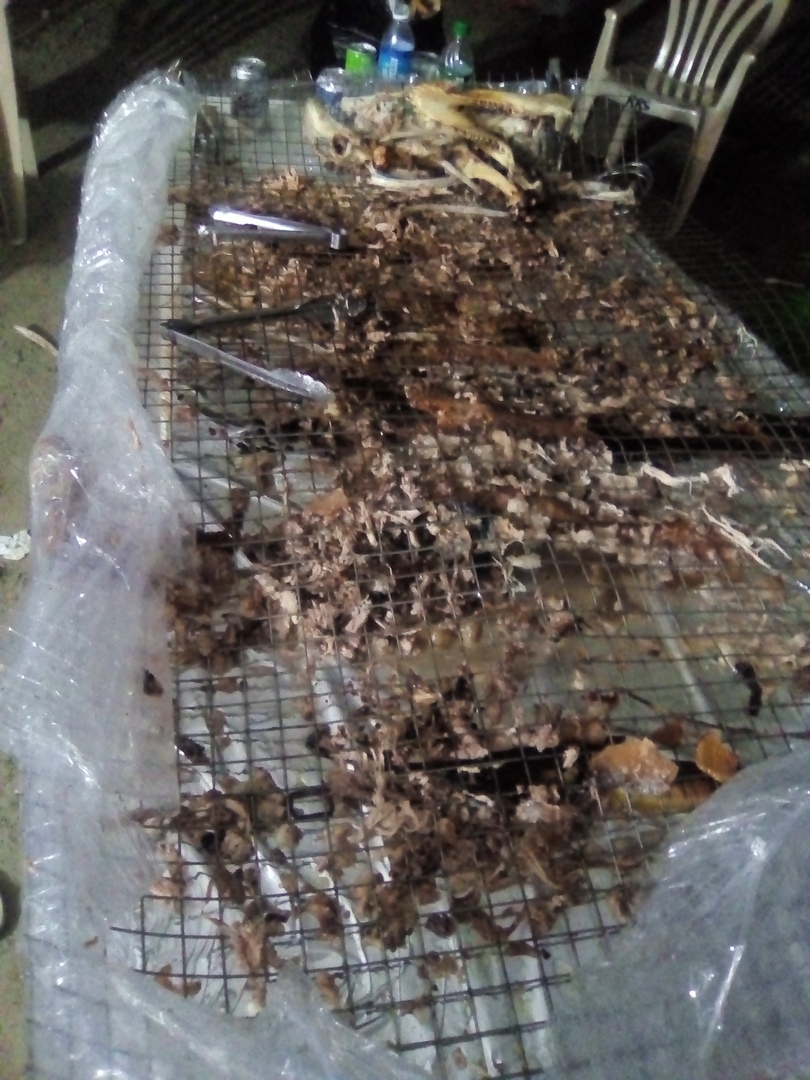 Кроме сосисок и салатиков я остановил свой выбор на маринованных плодах хлебного дерева, тапиоке под кокосовым соусом, на вареных клубнях таро и, разумеется, на печеной свинине. Честно говоря, я очень боялся, что будет невкусно, или как минимум не солено. Однако, умелые сонсорольцы при разделке предусмотрительно заложили куски каменной соли в лимфоузлы нашей бывшей хрюшки. Если знать, куда помещать соль, то при готовке в земляной печи она распределится равномерно по всей тушке. Так что мои опасения не оправдались, и от свиньи остались только "рожки да ножки".