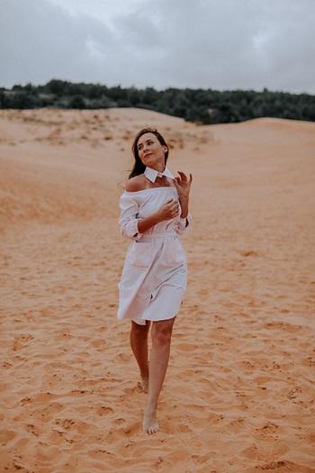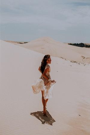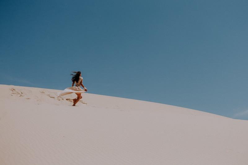 Поднимаясь наверх к пескам пинали чьи-то кепки, сланцы. Белые Дюны можно назвать кладбищем пустых бутылок от шампанского и шлепанцев. Добравшись до первых Дюн я сразу накинула на себя свой образ и пыталась как могла в +50 оправдать эту поездку, фотографируясь на память. Не знаю сколько воды из меня утекло, но такая фотосьемка была невероятно сложной. И уж точно никаких 1,5 часа для фотографа по объявлению тут не хватило бы. И не уверена, что он захотел бы подниматься пешком. Я была довольна такой не стандартной для меня сьемке, поэтому тот час, что я бегала по волнам из белого песка мне запомнился не только растекшейся до колен тушью. И если вдруг встанет выбор между Красными или Белыми Дюнами, то выбирайте Белые.