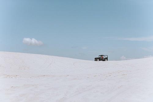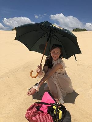 А после полученного эстетического удовольствия на озере пришлось снова переодеться, да еще и гостиничным зонтиком прикрыться. Так распогодилось, что стало плюс 50. На фоне белого горячего песка плыл и горизонт и таяла кожа на теле. Я чувствовала себя чоко паем в микроволновке на белом блюдце. Место Белые Дюны оказалось более популярным. Стоял магазин и ресторан и прокат машин, квадроциклов. Было так жарко, а подниматься до Дюн казалось немного, но днем стало так невыносимо, что решили уже взять услугу аренды квадрика. По условиям аренды стоимость составляла 2.600 донгов. Это с учетом того, что везет водитель одного человека. Не катает, а поднимает и 10 минут ждет. затем спускается обратно. Отсутствие тех самых 100$ , которые нужно было заплатить за двоих человек просто не было в кошельке. Я и подумать не могла что это может так дорого стоить. Решили идти сами. Поднимались полчаса.