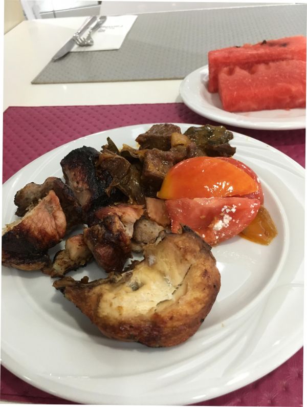 Греки киприоты даже на завтрак и тем более на ужин предлагают гостям много мяса. Хочется попробовать и вот такую с корочкой зажаренную курочку и нежнейшую розовую говядину, и шашлык из свинины, а также говядину, тушеную с овощами.