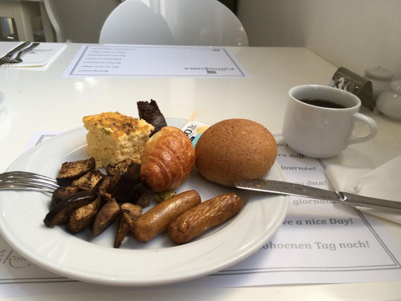 Колбаса и сосиски на завтрак - миленькая закуска. Я выбрала для себя сосиски, запечённые в жиру, как на фото выше. Предлагают также вареную колбасу, ветчину, вареные сосиски. Но это для не гурманов.