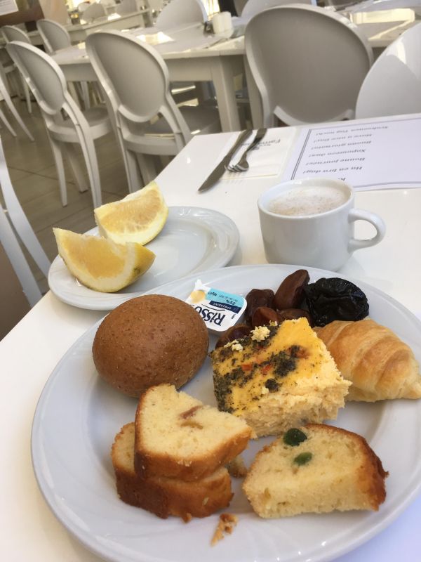 С утра приятно выпить чашечку кофе (который здесь в ассортименте) и съесть плюшку. Отель, где я отдыхала всего лишь «три звезды», но на завтрак всегда можно было получить свежую выпечку. Вот как видно на фото ниже – круассан, еще теплый, булочка, вместо хлеба и вот тот маленький кусочек на заднем плане – это шоколадный нежнейший бисквит.