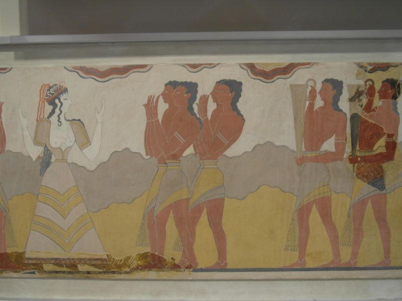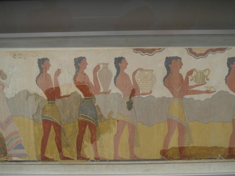 Наша вылазка в археологический музей заняла целый день. Он просто потрясающий! Экспозиция представляет этапы ранней истории цивилизации. Какими были отношения в обществе древних людей можно понять по фрескам. Вот вроде этой, где люди приносят дары критскому царю.