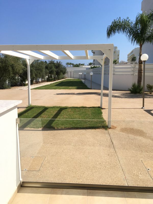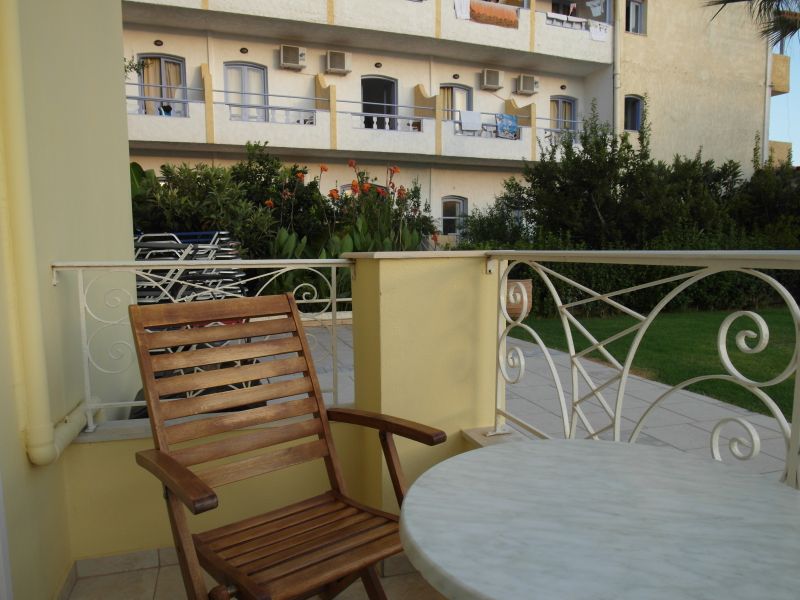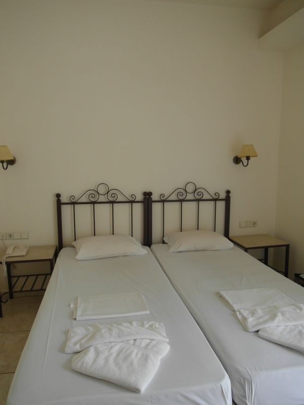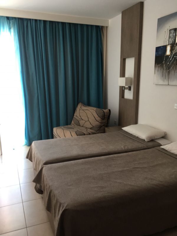 Мой номер оказался на первом этаже, что означало, что нельзя открывать балкон надолго ни днем, ни ночью и пришлось жить при кондиционере. В номере две кровати, пара разномастных кресел, телевизор (если он кому нужен у моря(. Бесплатный для постояльцев вай-фай на всей территории отеля. Вид с балкона - это вполне ухоженный задний двор с зелененькими газонами аллеей из молодых олив.