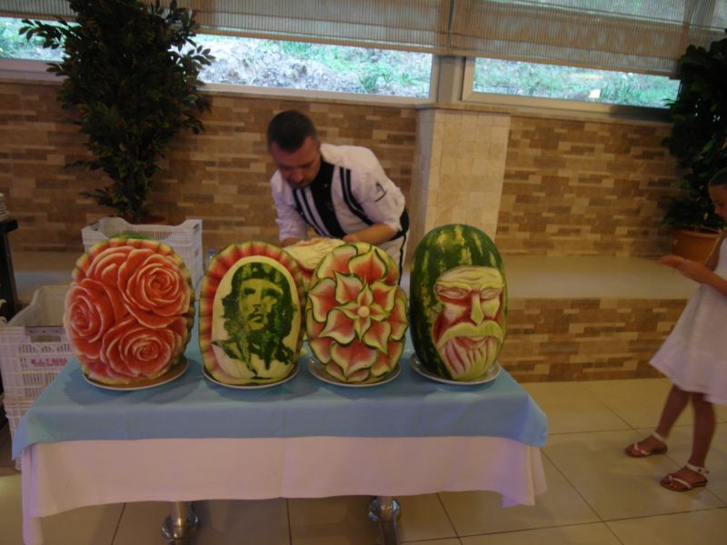 Трехразовое питание по системе "все включено" было прекрасным. В огромной степени это зависело от шеф-повара, человека творческого в готовке и не только. По праздникам, а иногда и просто по вечерам, шеф радовал нас своими шедеврами карвинга.