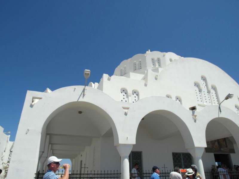 Вот этот белоснежный собор является кафедральным и находится в административной столице Санторини городе Фира. Он был построен в 1827 году. Узнать его можно по множеству каменных арок.