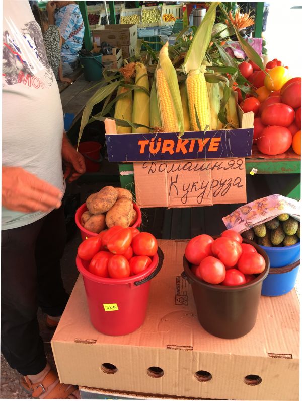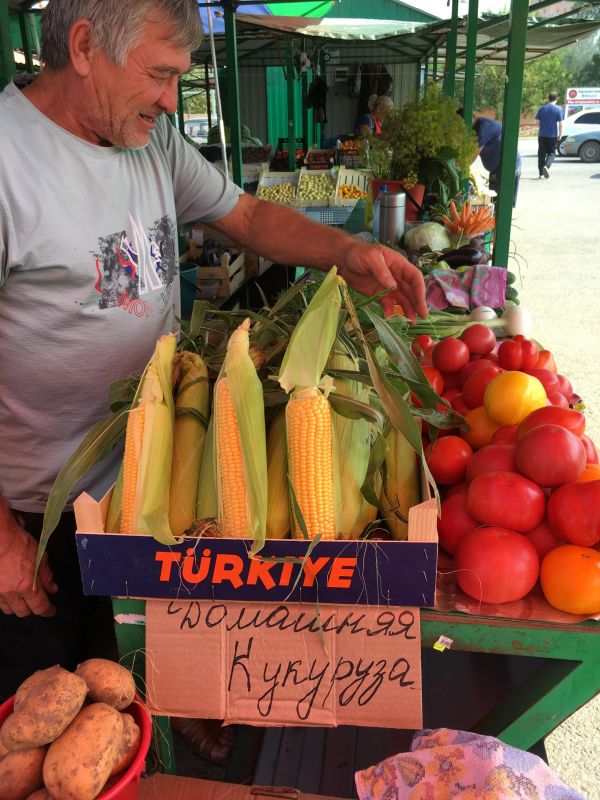 Сейчас поспели помидоры и кукуруза (указана цена за килограмм - 180 рублей)