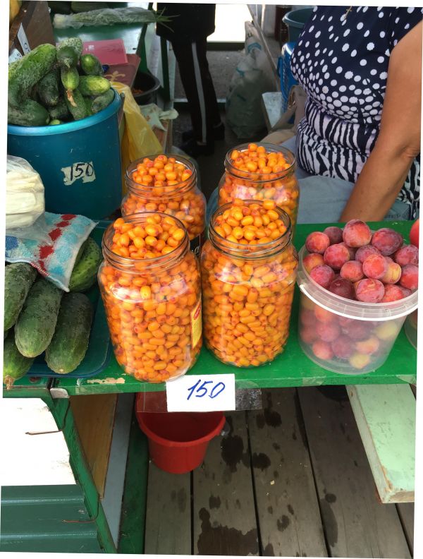 Перед вами ранняя облепиха, хозяйка сказала, что эту собрали, сплавляясь по реке. Одно время у нас было популярно лечение всего подряд облепиховым маслом – от ангины до ожогов. Также облепиху можно замораживать и заготавливать сок для морса.