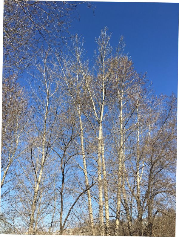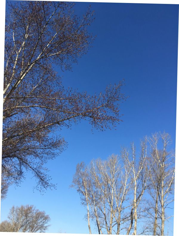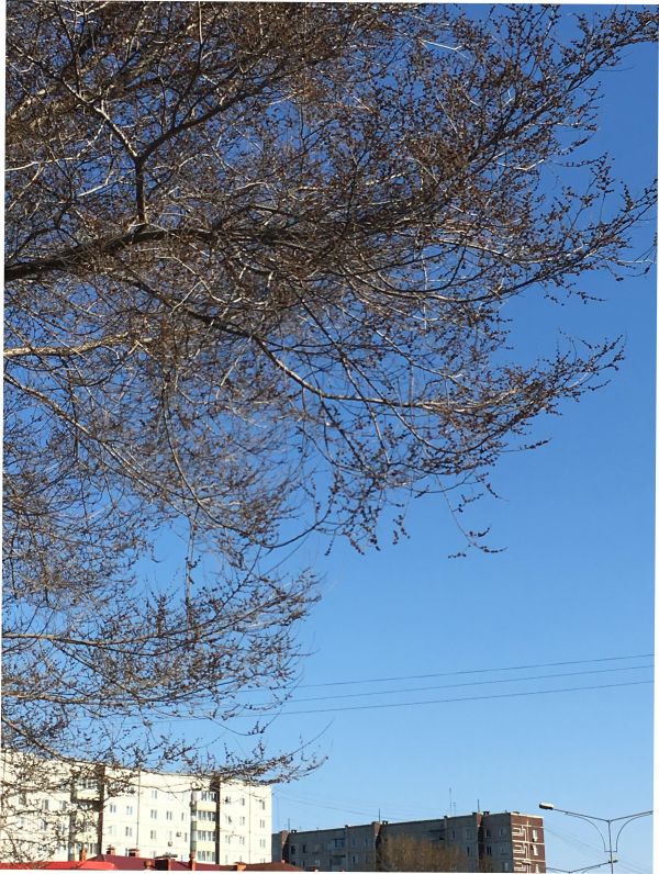 Быть может, у нас слишком холодная зима, но смена шагов видима буквально глазами. Вот такими были деревья неделю назад - на Пасху. Только малиновые почки тополей, которыми засажен весь город, построенный, начиная с 1930-х годов на здешнем болоте. Дело в том, что тополя забирают влагу, потому и растут здесь, чтобы осушать территорию.