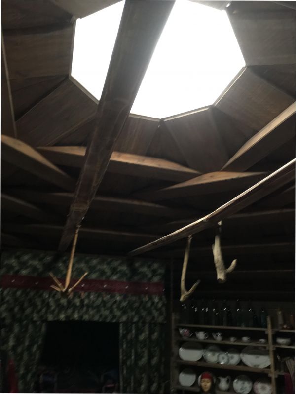 Топили юрту «по-черному», то есть для выхода дыма в потолке оставляли отверстие.