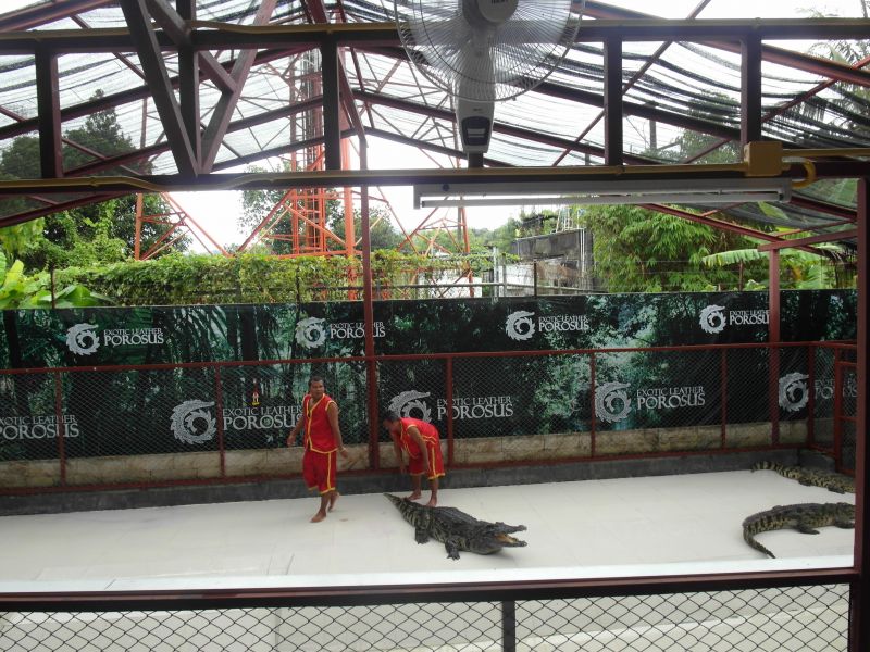 Дрессировке, как нам сказали, они не подлежат. И представление строится на использовании рефлексов. Сытый крокодил подолгу держит пасть открытой для вентиляции, этим и пользуются дрессировщики, помещая свою голову туда.