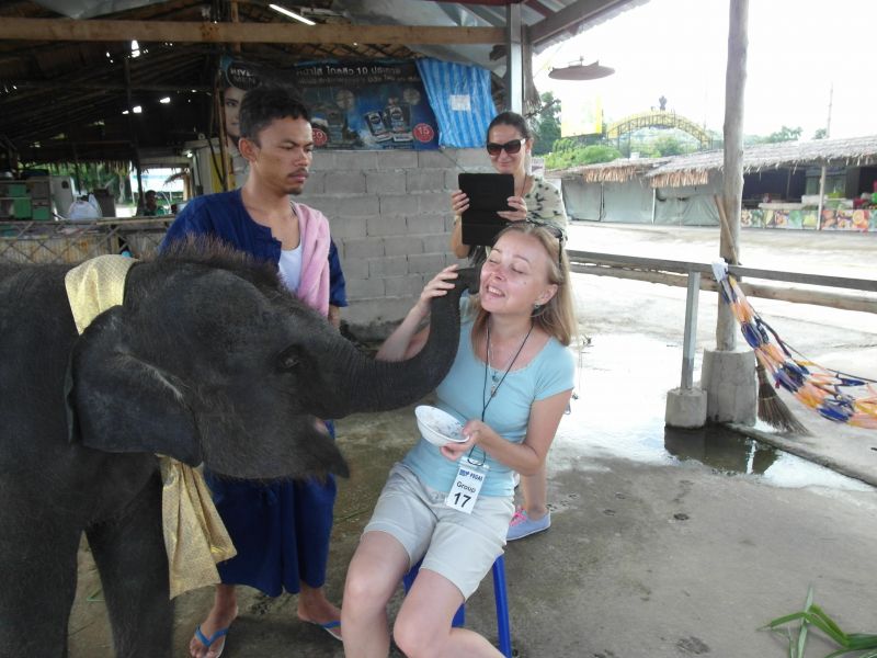 Вот этот полуторагодовалый слоненок зарабатывает на жизнь общаясь с туристами, он не боится вспышек и чужих людей. Меня вот поцеловал за чашку бананов