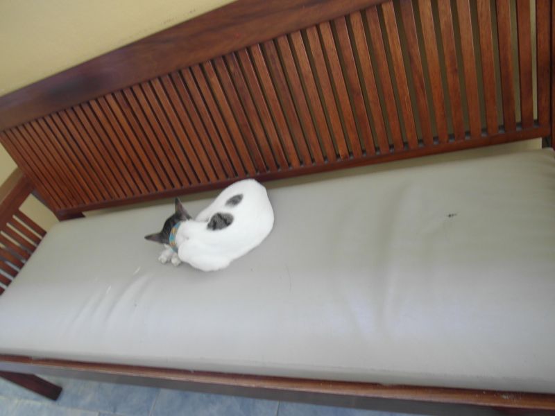 У них необычная по сравнению с нашими шерстка, она гладкая и жесткая. На одном из островов Пхи-Пхи, кстати только на том, где живут люди, существует целая колония кошек всех возрастов и размеров. Тайцы не против, разрешают находиться им в своих помещениях, но при этом обрезают кошкам кончики хвостов. По народному поверью, на кончике хвоста у кошки живет злой дух. Для отпугивания же злых духов на шеи животных подвешивают колокольчики. Так что повсюду стоит сюрреальный звон. И покуда мы не узнали его происхождение, было жутковато.