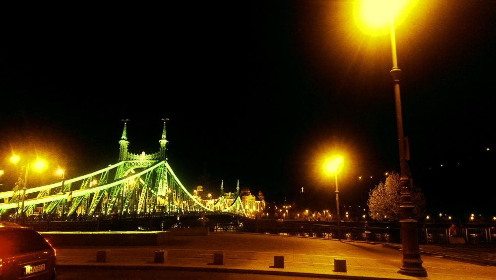 А это сам мост Сабадшаг (мост Свободы), построен в конце19 века, строительство приурочено было к знаменательной дате – тысячелетию Венгрии. Красят его в весёленький зелёный цвет и делают интересную подсветку. Во время войны, фашисты взорвали в Будапеште все мосты, но жители терпеливо поднимали со дна Дуная уцелевшие конструкции и восстанавливали переправы.