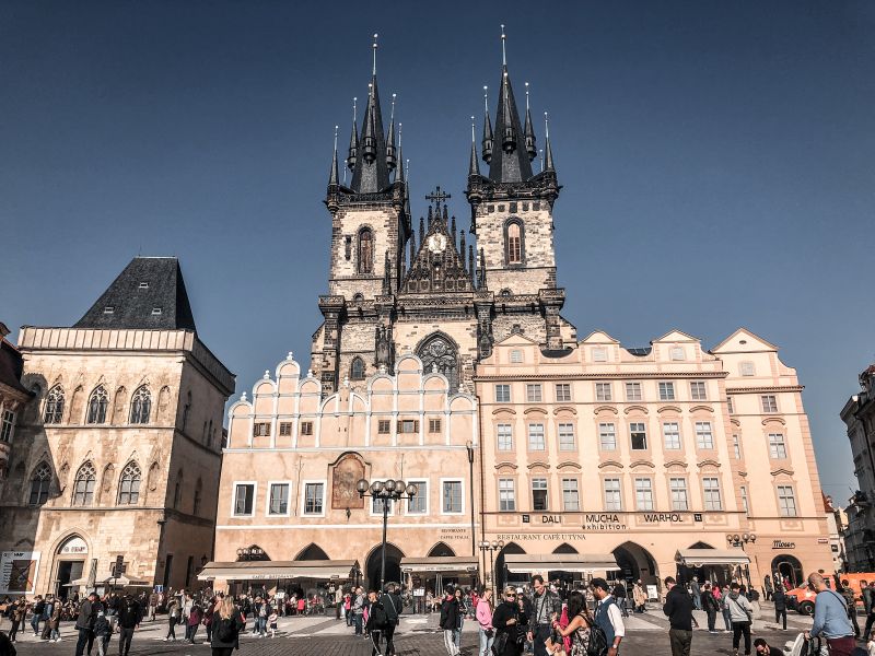 Украшает площадь Тынский храм или храм Девы Марии, который оформлен в готичестком стиле с барочными элементами.