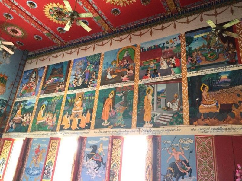 Во-первых, сами постройки находятся посреди рукотворного озера. Они как бы плывут в цветках лотоса, неспешно и умиротворенно. Посередине находится главный храм Плай Лем. Если зайти внутрь, то на стенах можно поразглядывать картины из жизни Будды.