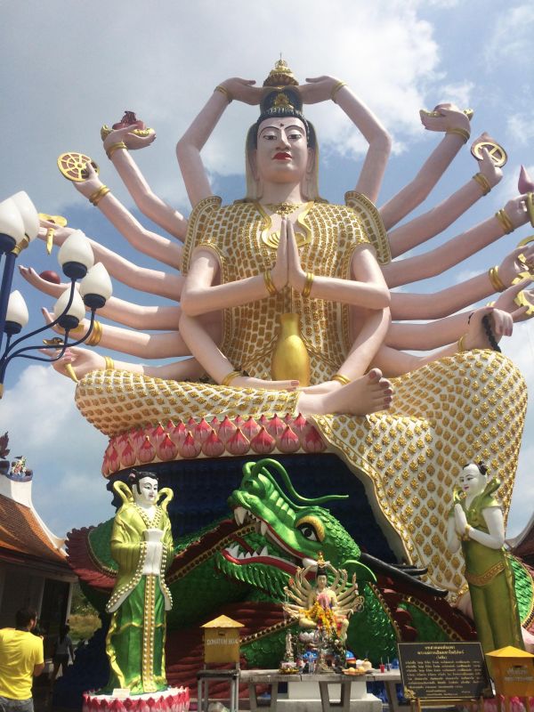 Справа от главного храма расположена многорукая статуя китайской богини Гуань Инь, которая оберегает семейное счастье, покровительствует обездоленным, защищает от бедствий и неприятностей, исцеляет от болезней. В общем, от всего. А поскольку она защитница, то в руках держит оружие от всех напастей. Хотя мне показалось, что в одной руке я видела мороженко, а в другой – улитку. Но кто знает, какие у неё методы…