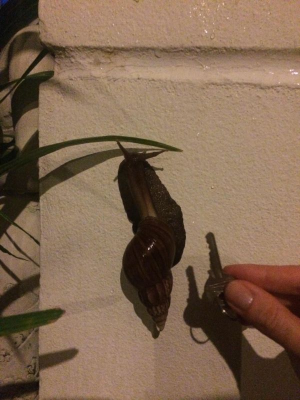 Наконец перестали лить затяжные дожди. Я вышла на веранду за домом подышать ранней свежестью. На полу сидела огромная бледно-жёлтая жаба. Я остолбенела. Я, конечно, уже стала привыкать к гигантским размерам улиток, гусениц, богомолов. Но вот жаба почти с кокосовый орех – это страшно. В моей голове мелькали воспоминания с уроков биологии, про жаб я напрочь всё забыла, но твёрдо решила руками не трогать. Сперва я подумала её напугать и громко крикнула на неё. Птицы слетели с веток, но бледно-жёлтая куча даже не дрогнула. Потом я начала топать и пшикать. Жаба сидела ровно, глядя вдаль. Мне пришлось пойти на крайние меры, я набрала мелких камушков и начала в неё кидать. Один из них таки попал ей по спине. Я замерла. И тут жаба повернула голову (я вообще до этого никогда не видела, чтобы лягушки могли головой вертеть) и так сурово на меня посмотрела, что я рванула в дом и захлопнула дверь. Эту схватку я проиграла.
