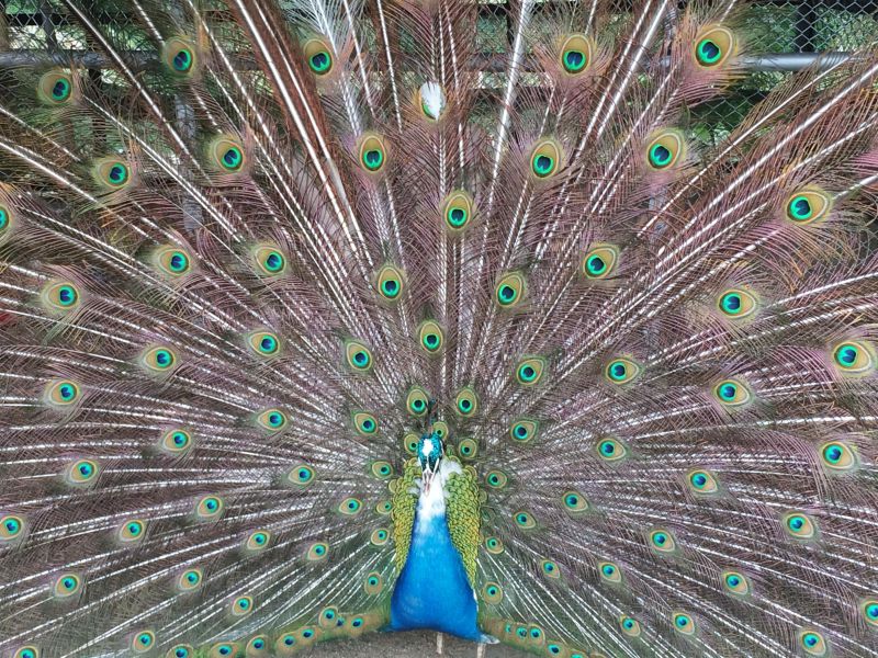Павлин гордо демонстрировал всю красоту своего хвоста, но ревностно отгонял желающих сфотографироваться на фоне его перьев. При нас парень делал несколько заходов для удачного кадра с павлином, и каждый раз был изгнан с истошным воплем самца и гневным укусом в шорты.