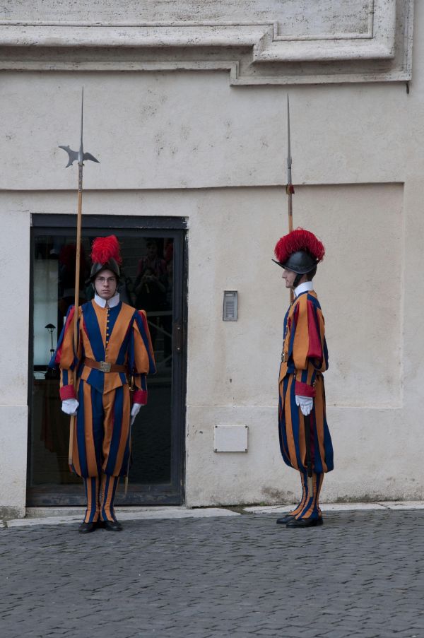 8) Ну, и на сладкое. Смена караула. Ватикан охраняют швейцарские гвардейцы, а в их ряды не так легко попасть. Список требований очень длинный, начиная от «быть уроженцем Швейцарии» и «католиком», заканчивая «рост не менее 174 см», « не моложе 19 лет, не старше 30 лет», ну и конечно, кроме образования и военной подготовки « иметь безупречную репутацию».