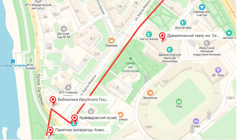 Я расскажу про места, через которые проходит маршрут «Зеленая линия». Начинается он с памятника Александру III и имеет очень интересную историю. Воздвигли его в 1902 году в честь царя, принявшего решение о начале строительных работ для построения Транссибирской железной дороги. Но в 1920 году памятник убрали и его судьба до сих пор не известна. И только в 2003 году Иркутская государственная дума приняла решение о полном восстановлении памятника этому легендарному человеку.