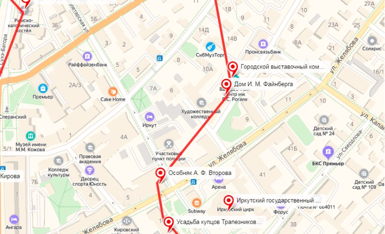Еще один по-настоящему красивый дом расположен на улице Желябова и носит название особняк Александра Второва. Этот дом являлся фамильным особняком, который был построен в конце 19 века и который воплотил в себе декоративные приемы Ближнего Востока и Индии, в частности. Напротив особняка Второва расположен Иркутский государственный цирк, в который регулярно приезжают со своими представлениями из разных городов артисты. А на площади перед цирком оформлена красивая площадка, на которой можно погулять, покататься на карусели или маленьком трамвайчике.