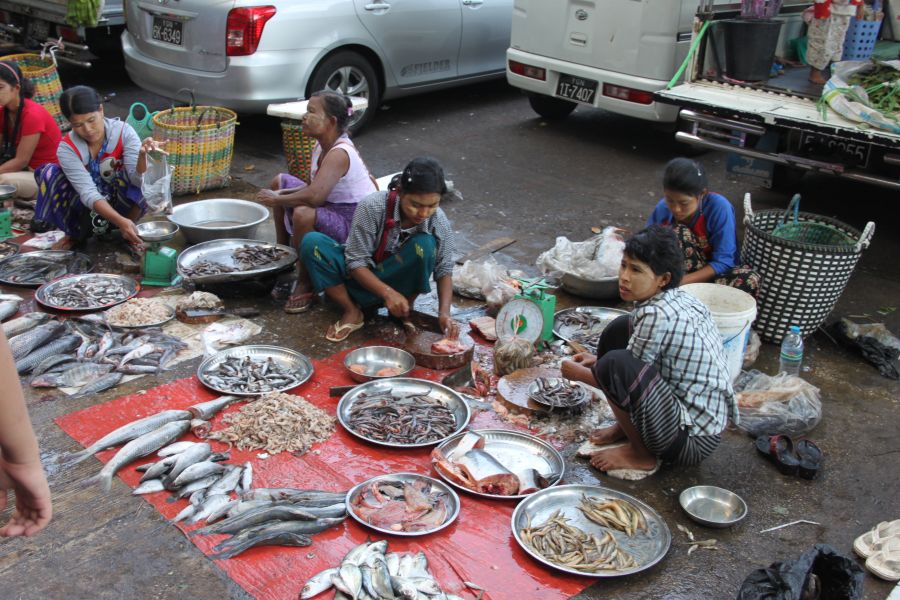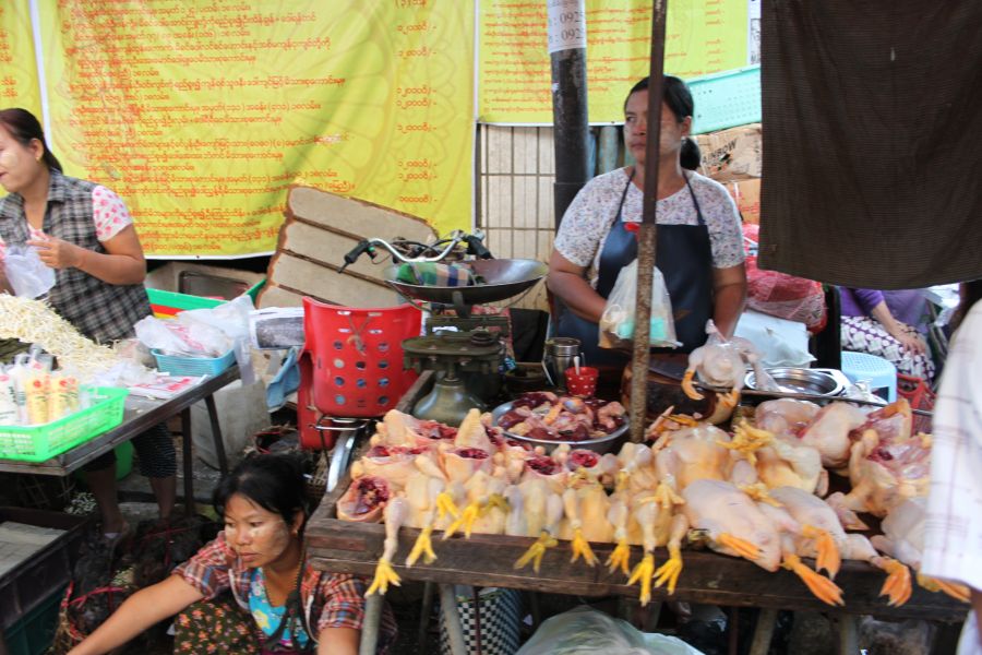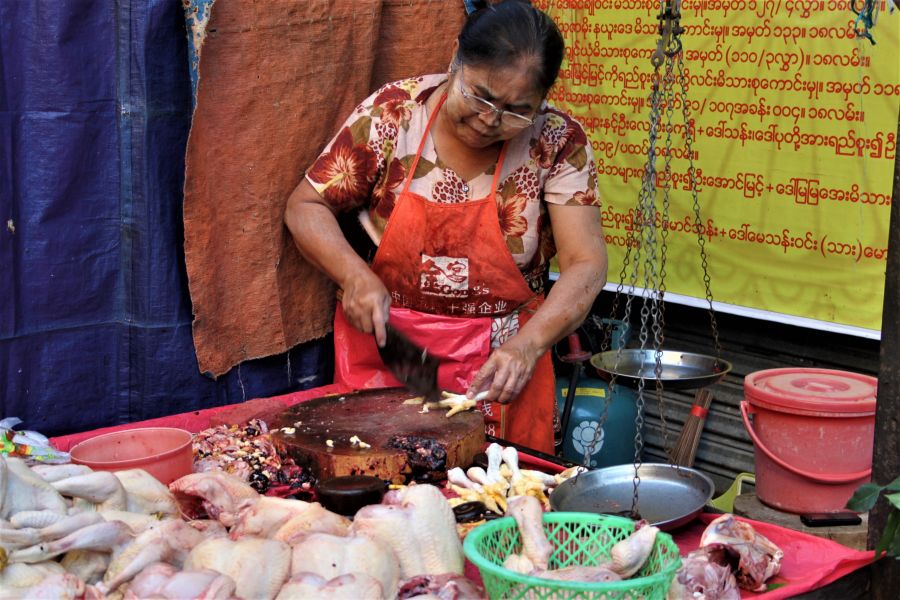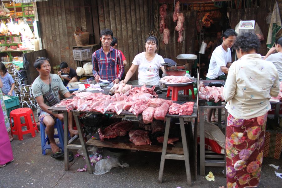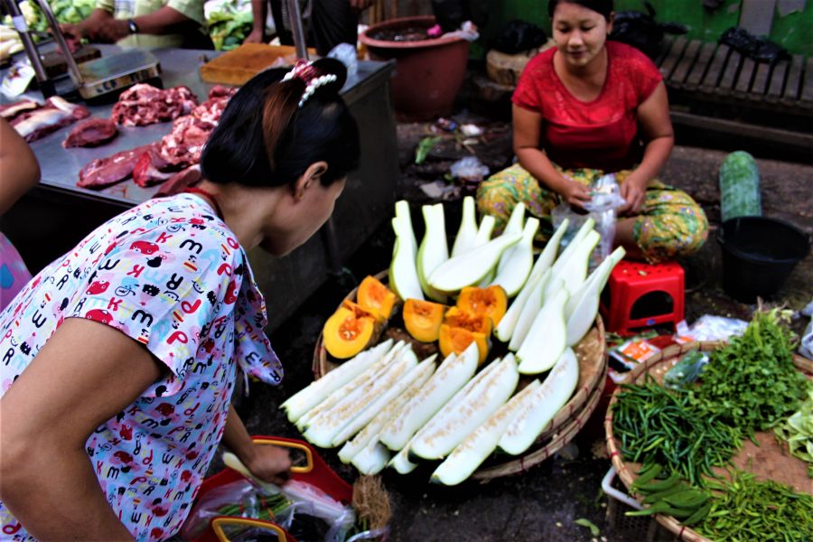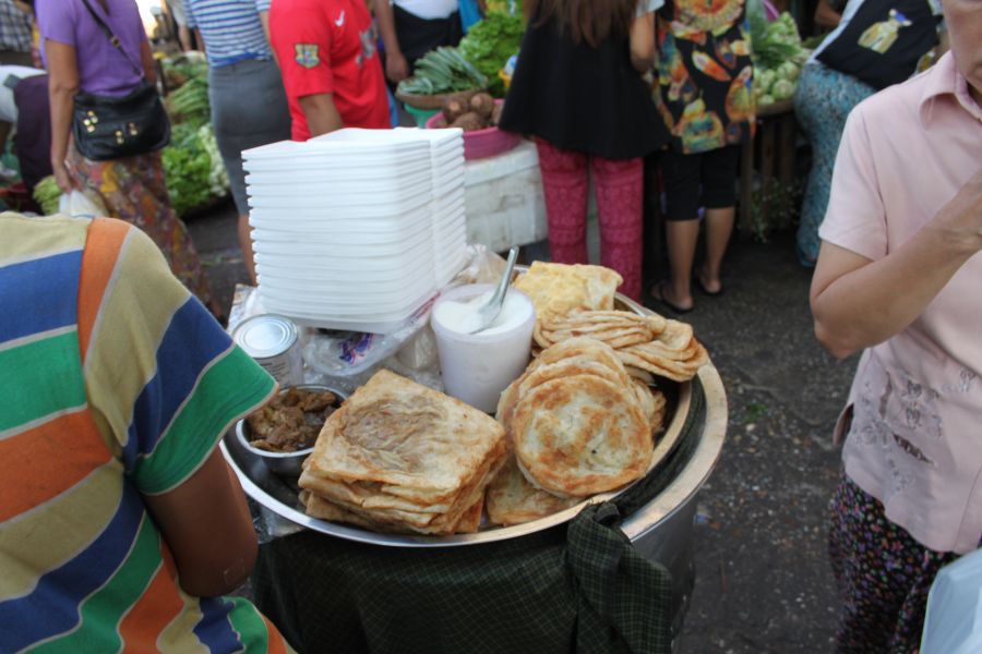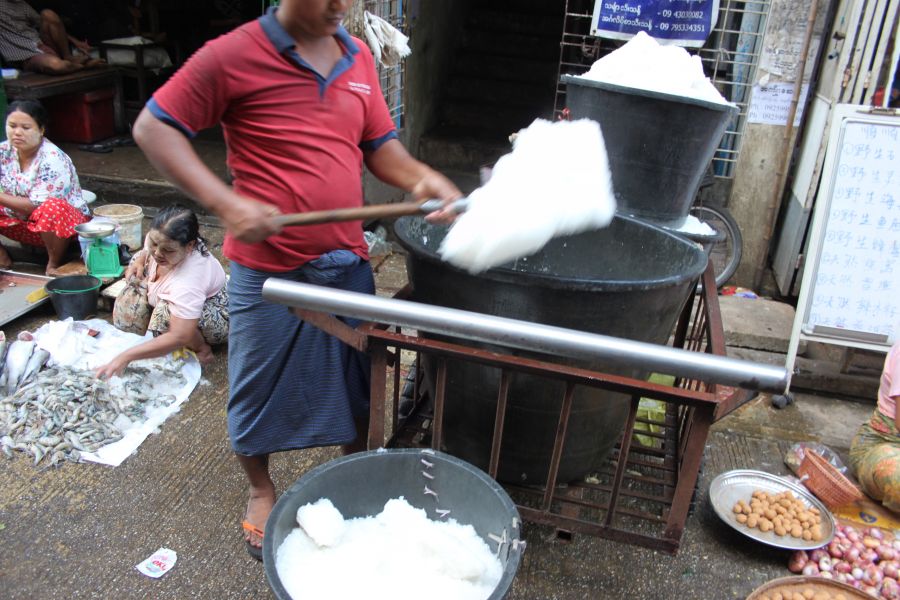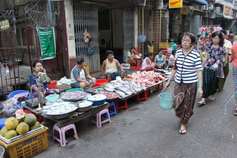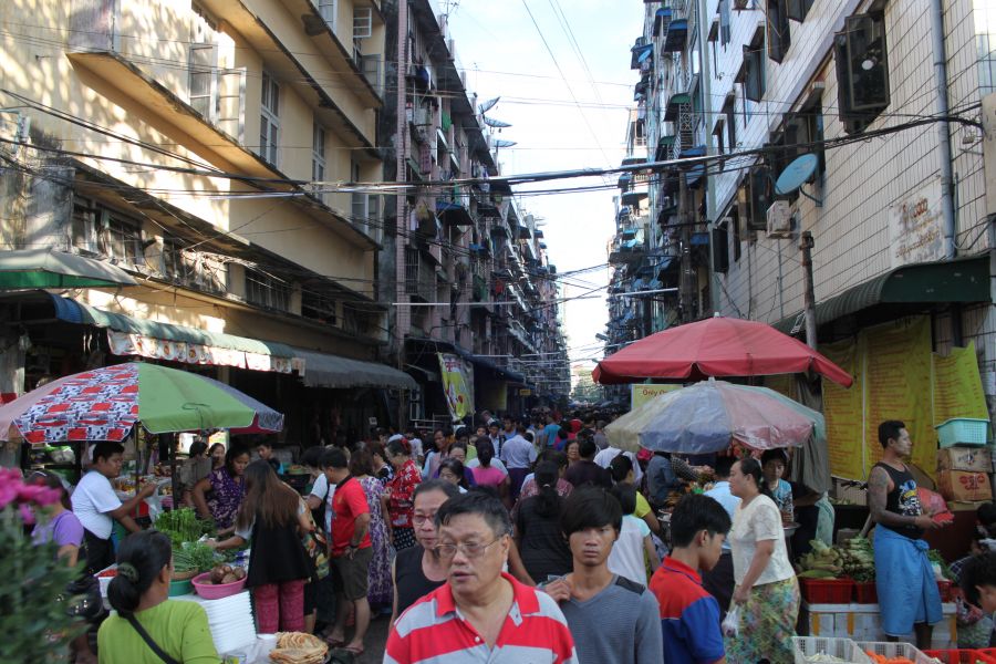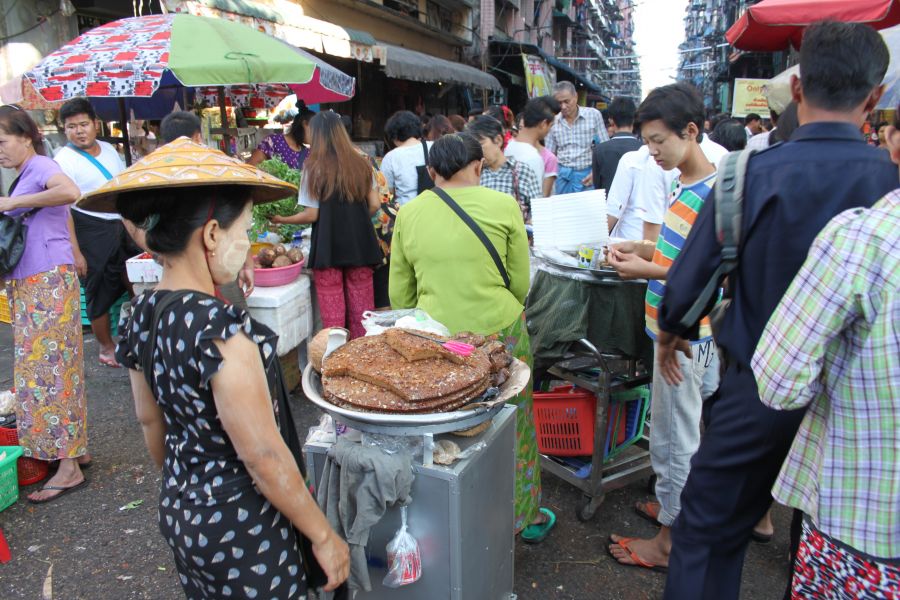 Вылез где-то через пол-часа езды, взял такси и поехал в китайский квартал – ещё одну достопримечательность для любителей экзотики и погружения в атмосферу города. В китайских кварталах всего мира царит хаос, но в таком шумном и пыльном городе, как Янгон, это должен был быть особый хаос, так и оказалось. Толпы народа, бойкая торговля вдоль улиц, продукты лежат прямо на тротуаре, даже я побоялся бы покупать. Попробовал какой-то фрукт, похожий на смесь дыни с огурцом, по вкусу он оказался всё-таки огурцом. Потом какую-то выпечку – тоже не впечатлила, что-то типа пончиков. Сделал несколько фоток и стал поскорее оттуда выбираться. Пока выбирался, нашел очень вкусный чебурек. Для примера, цены: огурец стоил 300 кьят, пончик 400, а вот чебурек 1500, то есть, на самом народном рынке цены не сильно впечатляют дешевизной (примерно 20 рублей, 30 и 70 соответственно).