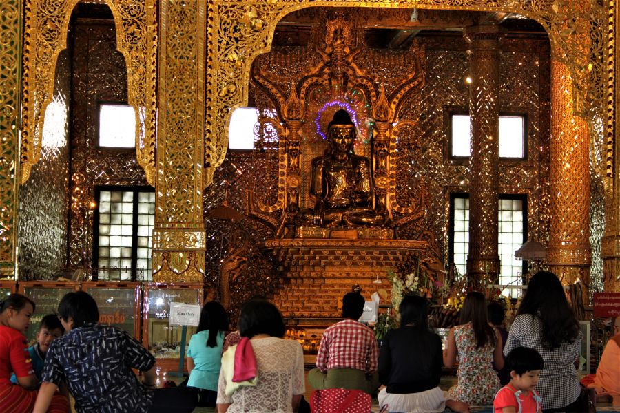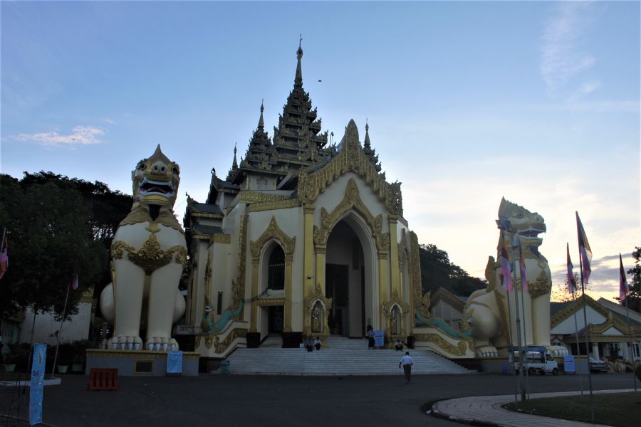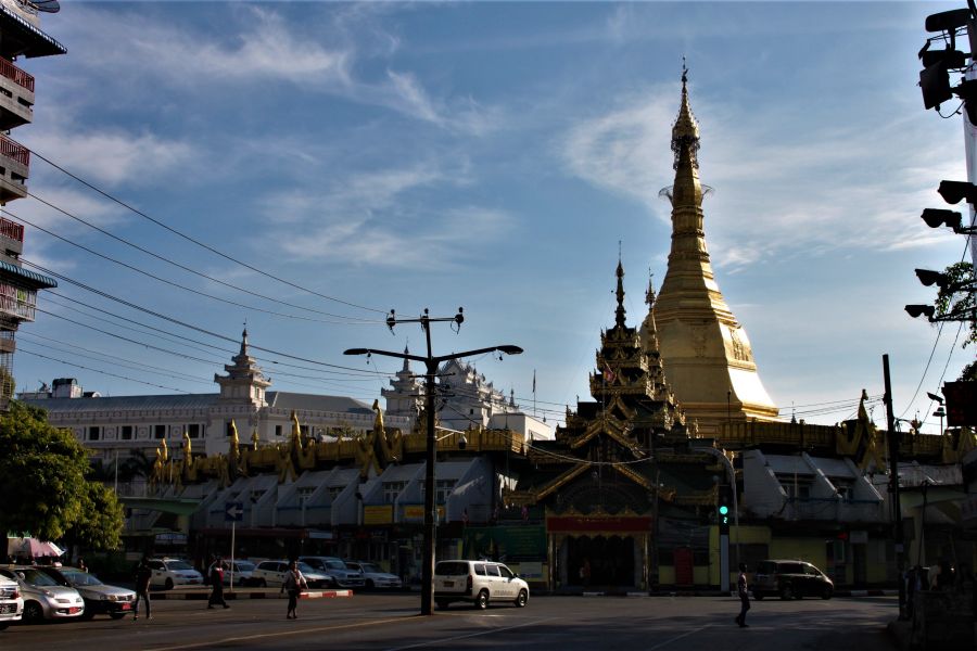 Теперь – к официальным достопримечательностям, и по пути у меня была пагода Суле – вторая по известности пагода после Шведагона, который я оставил на вечер. Это тоже ступа, покрытая золотом, но гораздо меньше Шведагона, и имеющая грани. Высота 48 метров, возраст около 2 тысяч лет, по легенде была построена раньше, чем Шведагон (говорят, что в ней и принималось решение о строительстве Шведагона). Ещё она находится в самом центре города, и раньше англичане от нее отсчитывали номера улиц (улицы так и остались пронумерованные – колониальное наследие). Теперь на площади, в центре которой она находится, есть приятный скверик, баптистская церковь и интересное здание колониальной постройки. Вход в пагоду платный, 4000 кьят. Обувь надо снимать и брать с собой в пакете, так как выход на другую сторону. Так как это была моя первая пагода в Мьянме, мне понравилось, если бы я был там после Шведагона и пагод Багана, то навряд ли бы впечатлился.