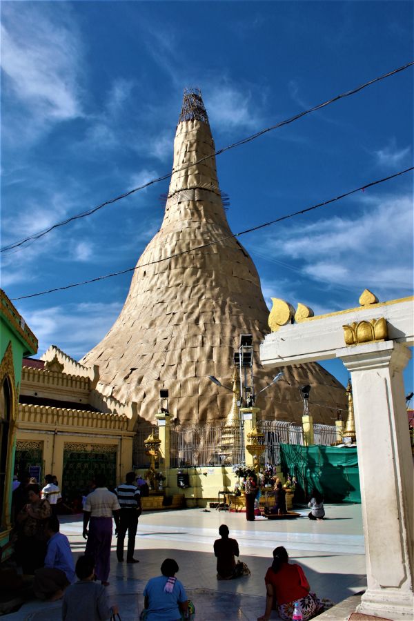 На пароме я не поехал, хватило поезда, а вот находящуюся недалеко пагоду Ботатаунг посетил – она, наряду с Суле и Шведагоном входит в тройку самых известных в Янгоне. Для буддистов она обязательна к посещению, для туристов – не очень, но, для полноты впечатлений, можно. К сожалению, был внешний ремонт пагоды, золотой слой был обклеен какими-то листками (я сначала так и воспринял ее, думал – оригинальный дизайн). Вход тоже платный, уже 6000 кьят (4,5 доллара - недешево), за это дают еще бутылочку воды и влажную салфетку, которые пришлись очень кстати - ну очень жарко. Да, во все пагоды билеты для местных и для иностранцев отличаются по ценам.