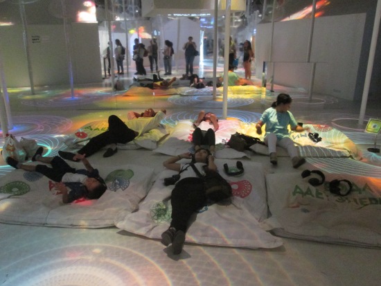 Был ещё один примечательный зал в Арт-центре – там можно было полежать, наблюдая на большом экране, как меняется абстрактный видеоряд. После марафона по ЭКСПО это очень успокаивает и даже усыпляет. Боясь уснуть, я полежала совсем немного и отправилась на автобусную остановку, чтобы не опоздать на поезд.