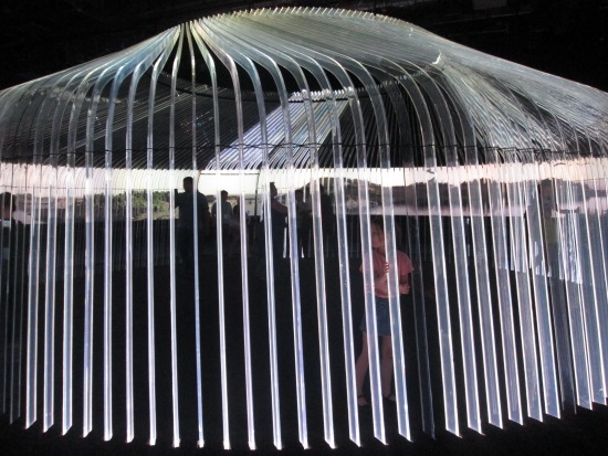 Как юрта попала в британские экспонаты? Оказывается автор британского павильона Асиф Хан учился в Казахстане. Впечатлившись культурой казахского народа и в частности юртой, он решил для своего павильона придумать юрту, которая начинает светиться от прикосновения человеческих рук, меня панораму по окружности то на день, то на ночь.