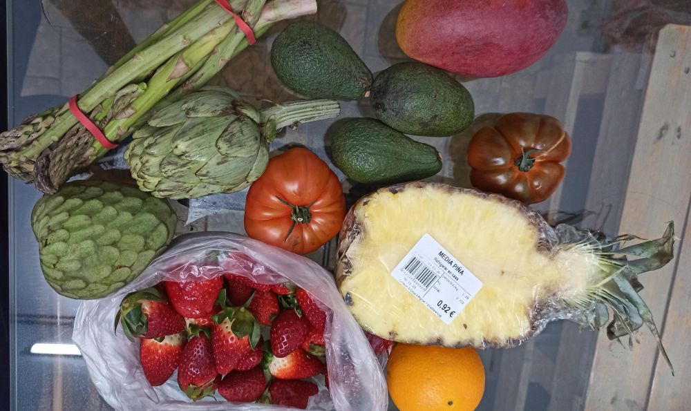 Позже мы все таки взяли в небольшом магазине клубнику, апельсин, пол ананаса, артишок, спаржу, черимойу (как оказалось), помидоры, авокадо и манго