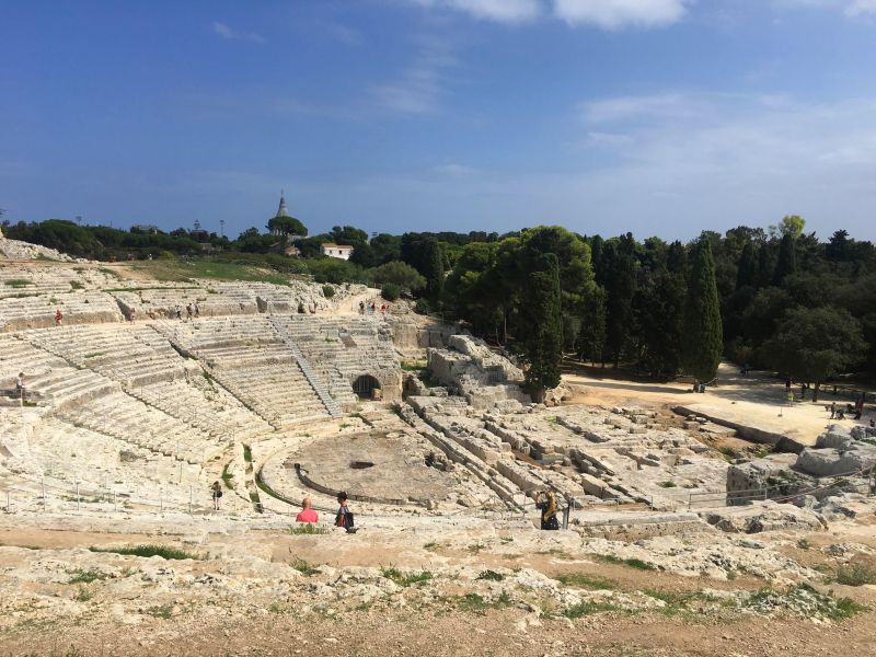Греческий театр появился в V в. до н.э. Он был вырублен в скале, что делает данное место еще более невероятным и величественным.Театр вмещал 16 тысяч зрителей, и во времена Древней Греции здесь ставили трагедии Эврипида и Эсхила. Во времени Римской империи на его территории проводились смертоносные и кровопролитные гладиаторские бои. А сегодня театр опять вернулся к своему первичному предназначению, и вы можете посмотреть, как и много веков назад, классические греческие трагедии. Отсюда же открывается вид на известный вулкан Этна.
