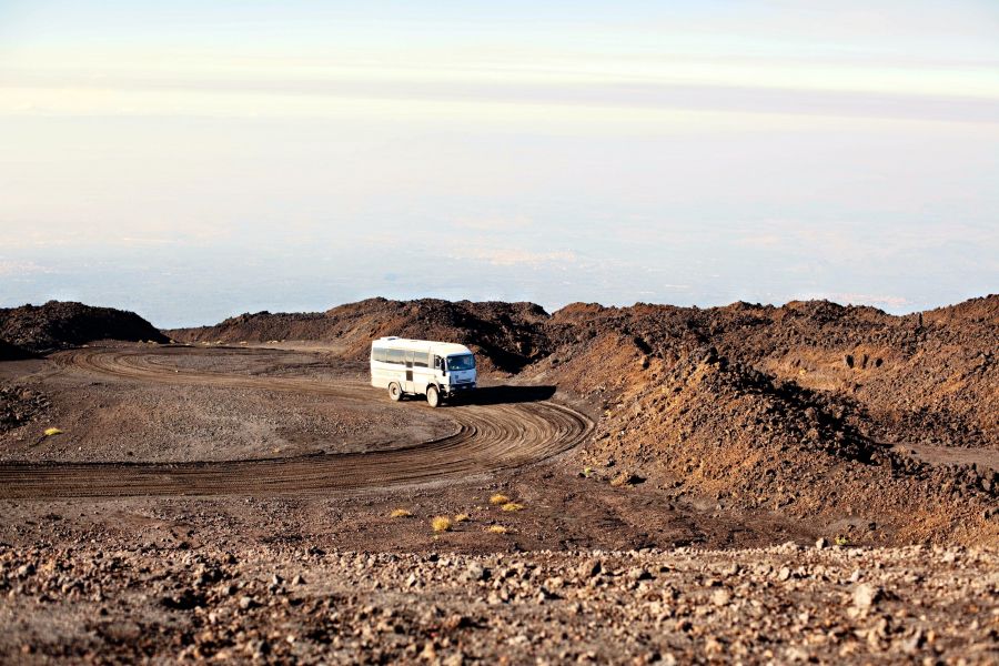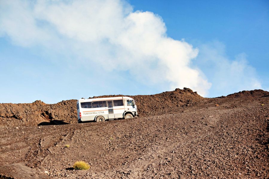 Дорога к Этна – это сплошные серпантины. Она одна, практически без развилок, поэтому потеряться невозможно. Приехав, машину можно оставить на стоянке и начать восхождение. Дальше только пешком, по крайней мере посреди ночи так точно. Позже начинает работать канатная дорога, о которой писала выше, до высоты в 2500 метров, а дальше, если не хочется ходить пешком, ко второму по высоте кратеру ездят автобусы, при взгляде на которые кажется, что ты попал на Марс. Цена автобуса 35 евро. Канатная дорога в одну сторону – 22 евро. Но пешком невероятно. Все эти виды, камушки. Мы только обратно спускались на канатке, пропешеходив весь день. После этого прокатиться и увидеть все то, что видел, с другого ракурса, еще и сидя, было чудесно.