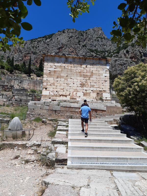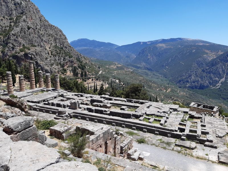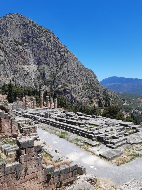 Итак, минуя многочисленные сокровищницы, бронзовые и мраморные статуи, изваяния страшных, покорённых человеком чудовищ, паломник подходил к храму Аполлону. Храм пару раз в результате пожаров или землетрясений разрушался прародительницей бога - всесильной, временами гневающейся на род людской, Геей. Согласно Павсанию, самый древний храм был построен из лавра и был похож, скорее, на хижину. Второй обязан своим происхождением пчёлам и был построен из их крыльев и воска (его Аполлон подарил гиперборейцам). Последний храм Аполлона (руины и платформу которого мы видим сегодня) - это классический тип дорического периптера. Периптер в переводе на русский означает "оперенный", то есть обнесённый со всех сторон колоннами.