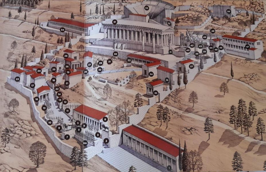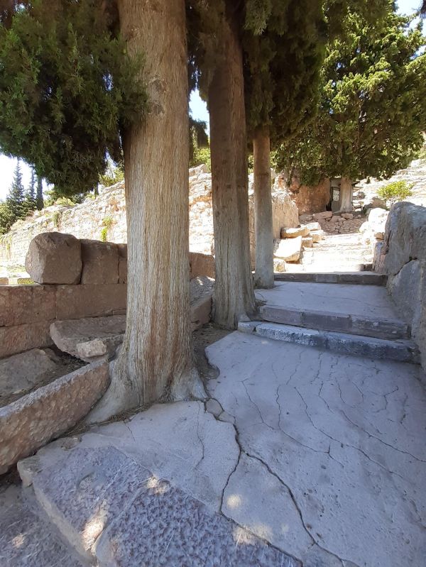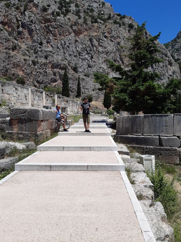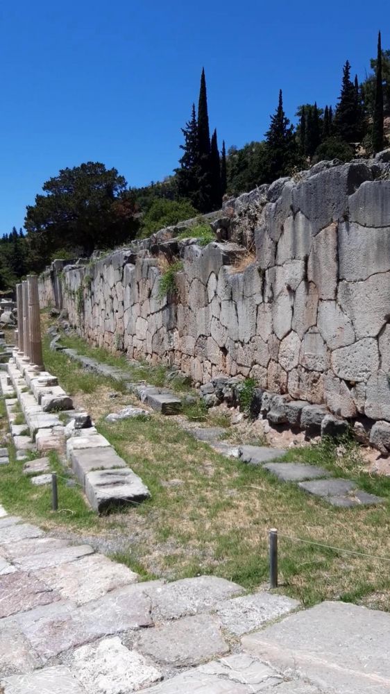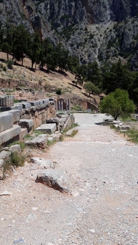 Ιερά Οδός (ИерА ОдОс) – Священная дорога вымощенная камнем, главная змееподобная улица дельфийского святилища (говорят, это тело того самого дракона). Вдоль неё располагались сокровищницы, которые стремился поставить в Дельфах каждый город, – выдающиеся произведения зодчества. Скульптурных памятников (бронзовых статуй и мраморных скульптур прославленных скульпторов Эллады) было огромное количество (Плиний упоминает около трёх тысячах статуй!!!).
