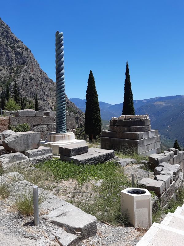 Одинокая витая колонна на повороте к храму восстановлена по оригиналу Змеиной колонны, вывезенной императором Константином из Дельф в Константинополь, где и стоит до сих пор. Она была создана в честь победы греков над персами при Платеях в 479 г. до н.э. По словам Геродота колонна была отлита из вражеских щитов и мечей и имела высоту 8 метров. Её венчали головы трёх змей, державших золотой треножник (трипод, естественно, быстро и бесследно исчез, головы отвалились и тоже канули в Лету, за исключением одной, мирно покоящейся сегодня в Стамбульском музее). На "завитках" колонны были высечены названия 31 греческого государства-города, принявшего участие в битве против персов.