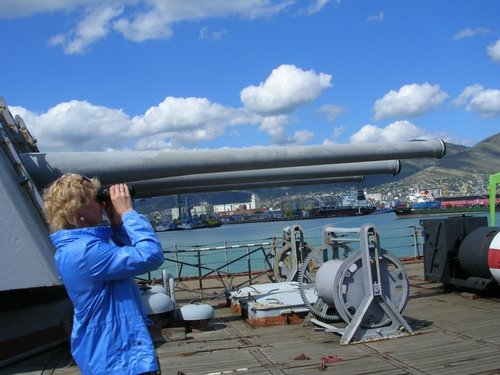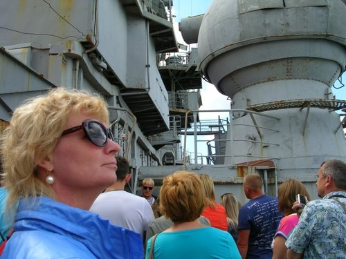 В прошлую поездку, посещая город-герой Новороссийск, нам не удалось попасть на борт крейсера-музея «Михаил Кутузов». Зато в этот раз мы восполнили этот пробел с лихвой — экскурсию по нему нам провёл настоящий «морской волк», в своё время служивший на нём. Полностью по всему кораблю экскурсантов, конечно, не водят, но изучить верхнюю палубу и спуститься в офицерскую кают-компанию им дозволяется: