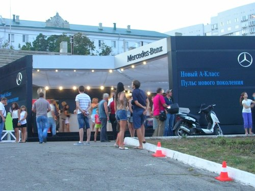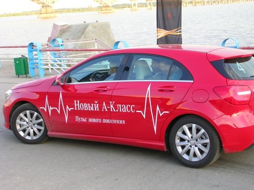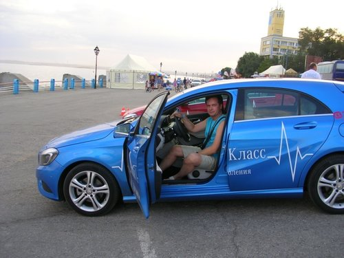 Во время прогулки по набережной наткнулись на шатёр от дилера Мерседеса, где предлагалось всем желающим пройти тест-драйв нового А-класса, чем мы и не преминули воспользоваться на пару с сестрой, у которой с собой тоже оказались водительские права. Нам выдали специальные бэйджики и на руку надели браслеты с фирменной надписью, только ей достался красный автомобиль, а мне синий: