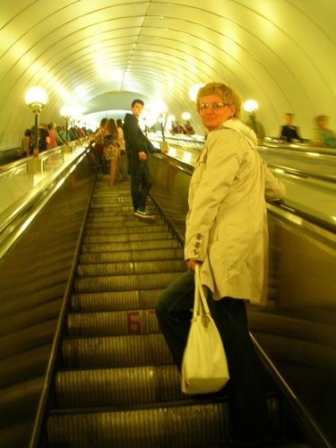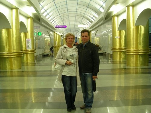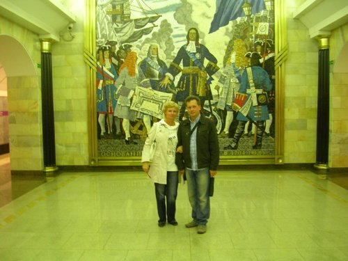 Не обошли вниманием и питерское метро, в котором почему-то властвуют сильные сквозняки. Особенно нам понравился комплекс, совмещённый со станцией Международная, отсюда мы совершали наши набеги на город. Выглядит он так — внизу под землёй собственно станция метро, затем три надземных этажа занимает торговый центр, четвёртый этаж — многозальный кинотеатр и ресторанный дворик (нам понравился пивной ресторан «Пиворама»), и пятый, шестой и седьмой этажи — надземный паркинг. В дальнейшем мы приспособились оставлять здесь машину и далее следовать на метро — на своих четырёх я так и не рискнул заехать в центр, всё больше катался по окраинам и Кольцевой автодороге (КАД). На следующих фото мы в «Пивораме», на станциях «Международная» и «Адмиралтейская», забавный дом-корабль на проспекте Славы и моя машина в надземном паркинге: