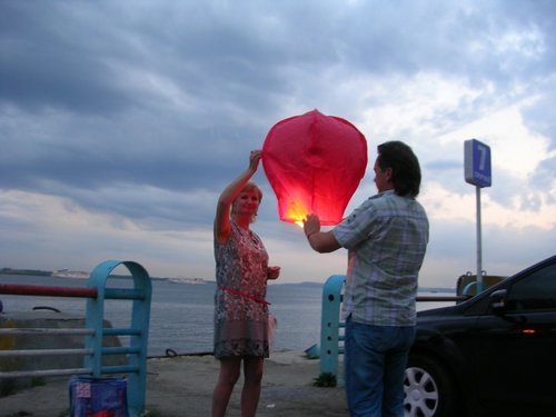 Далее программой вечера было предусмотрено посещение неподалёку расположенного караоке-клуба «Celentano». Подобных заведений в нашем городе нет, поэтому было очень интересно в нём побывать. Пока ждали открытия клуба, успели запустить в небо свадебный фонарик: