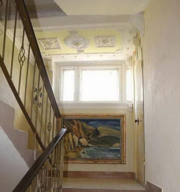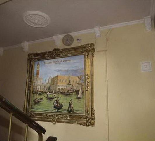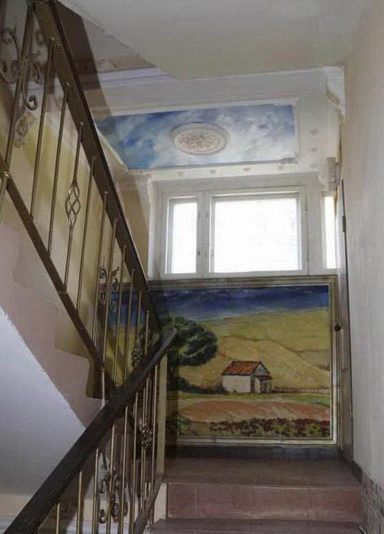 Очень интересная идея. Заметил, что подъезд украшен не только картинами. Своеобразные перила.А некоторые картины, как в галереях , находятся в красивых рамках))