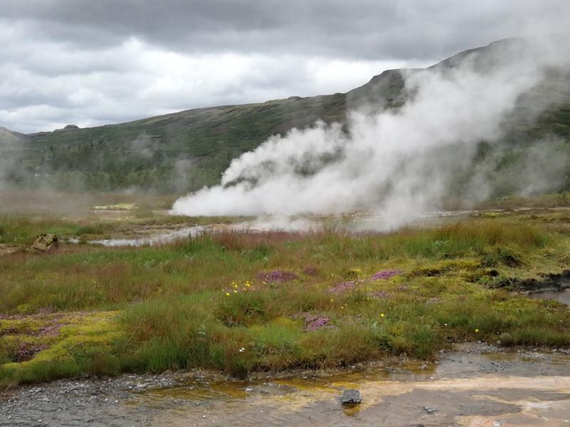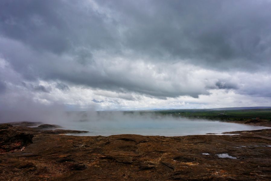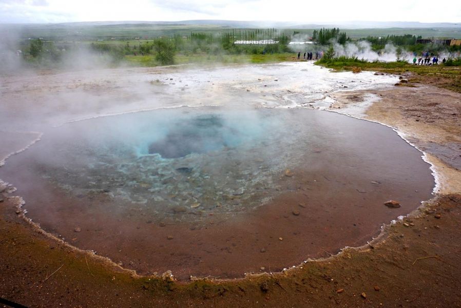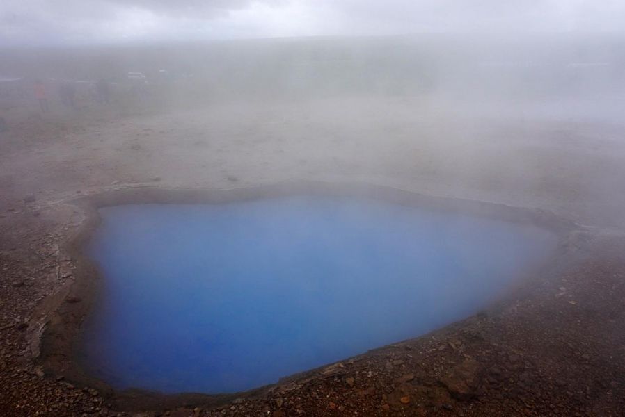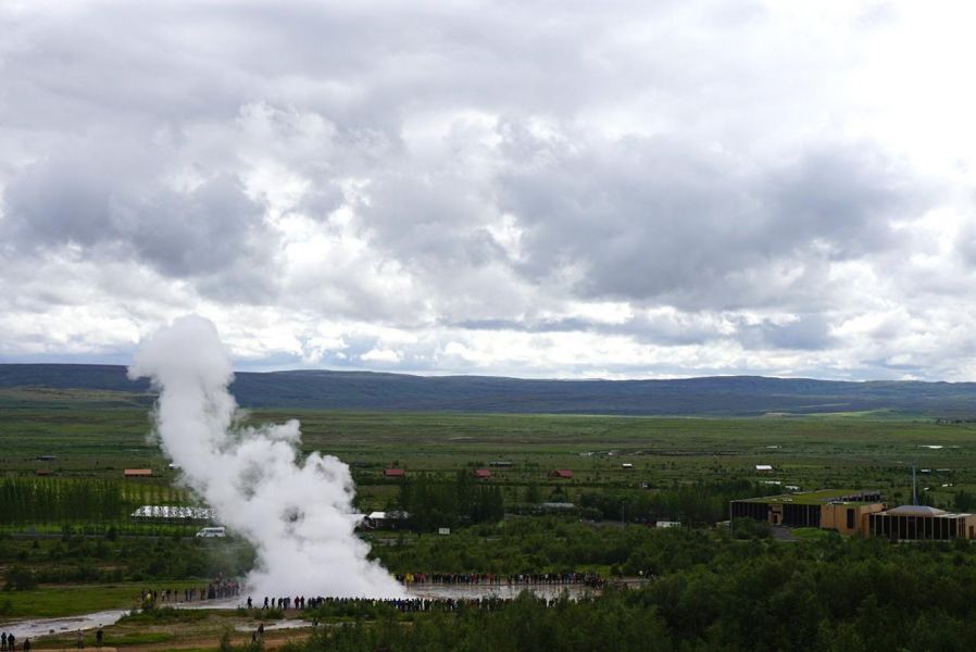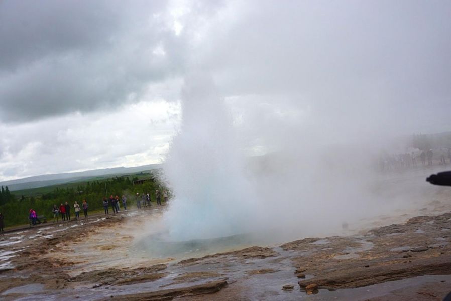 Но главная достопримечательность долины - это гейзер Строккюр. Он выстреливает фонтаном кипящей воды до 20-30 м. Толпы туристов стараются подловить этот момент, запечатлеть его на фотоаппарат, а если получится, то и своих друзей и близких на его фоне. Мы оказались в числе тех людей, кого гейзер щедро окатил своей горячей ароматной водой)