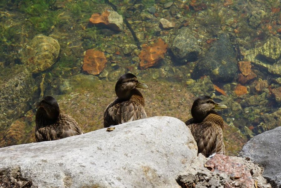 Это место облюбовано множеством разнообразных уточек, которые абсолютно спокойной плавают и греются на солнышке рядом с шумными людьми...