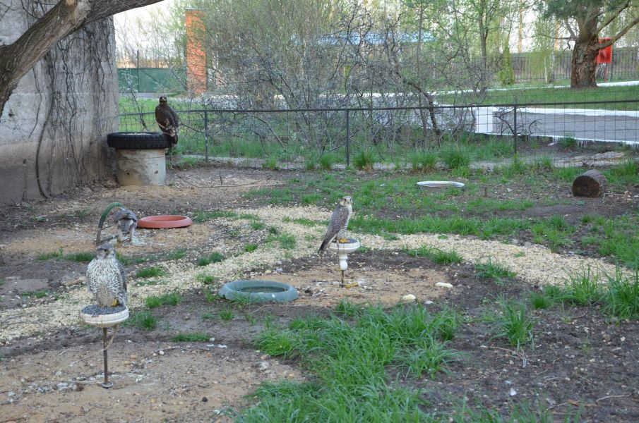 Внутри территории птицы, привязанные цепями.
