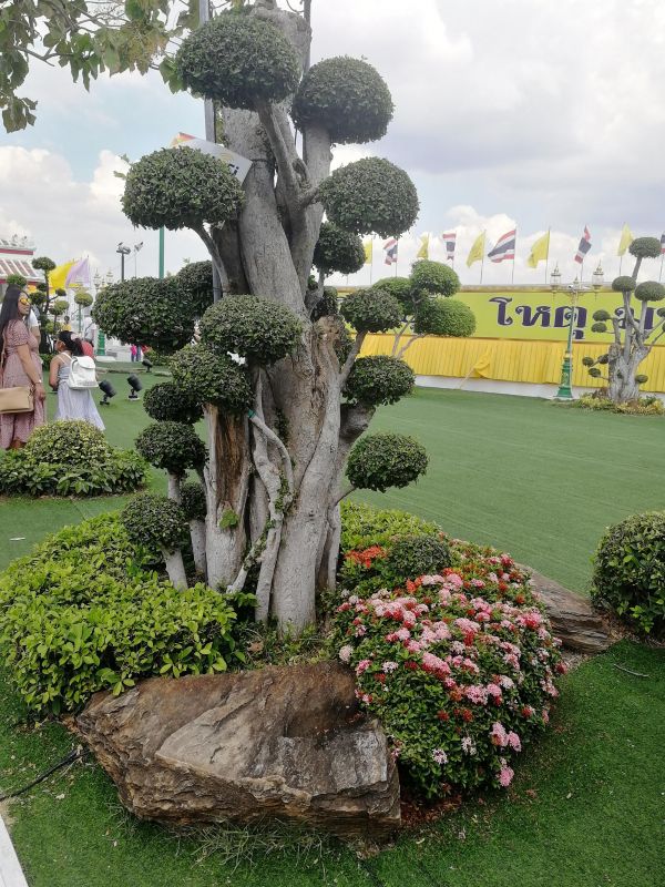 Кстати, территория вокруг храма ухоженная и красивая, с газонами, фигурными деревьями и орхидеями.
