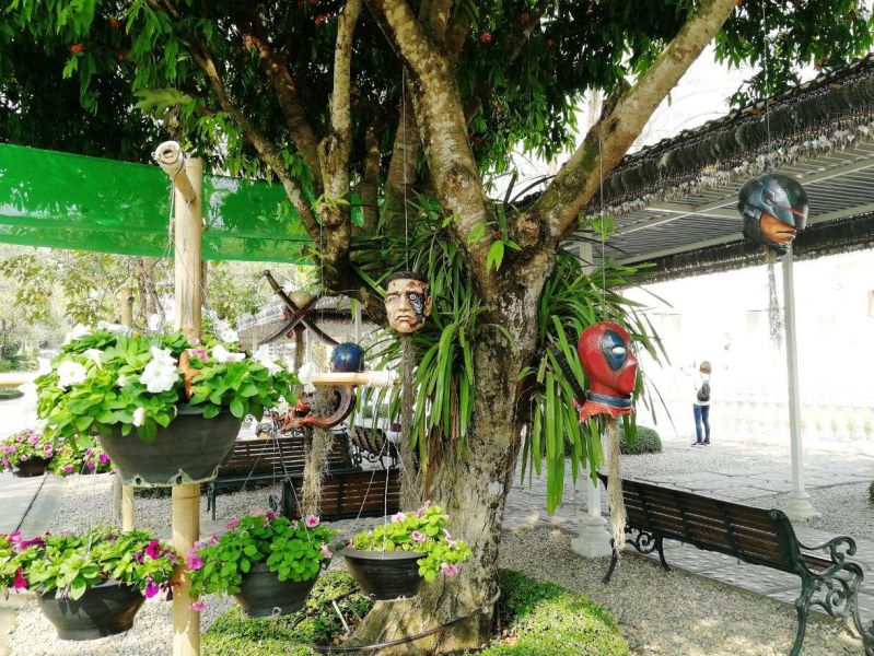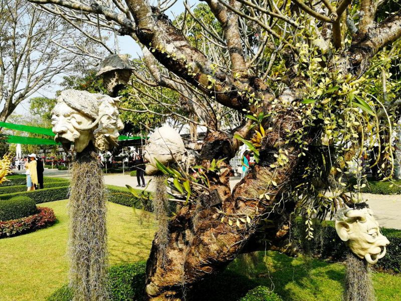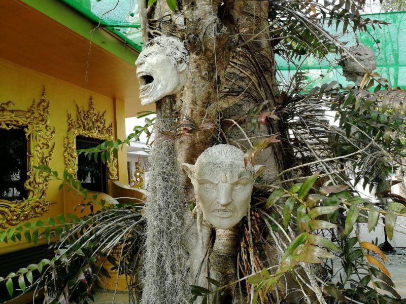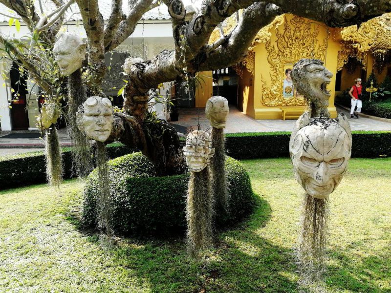Но не все на территории комплекса красивое, изящное, воздушное, изысканное. На одной из аллей на деревьях висят такие, немного жуткие головы: