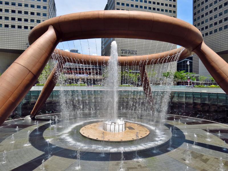 Фонтан поражает и своими размерами, и своей символичностью. Площадь основания составляет 1683 квадратных метра, общий вес металла около 85 тонн, а струи воды падают вниз с высоты 5-го этажа.